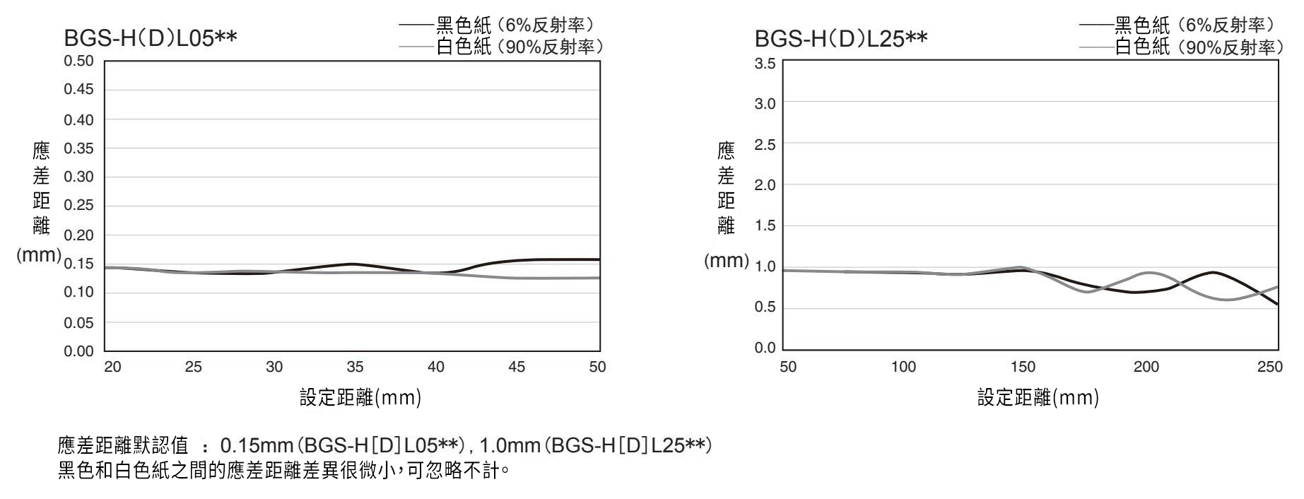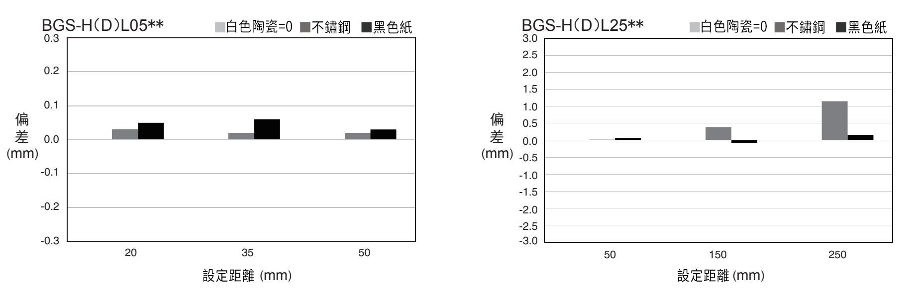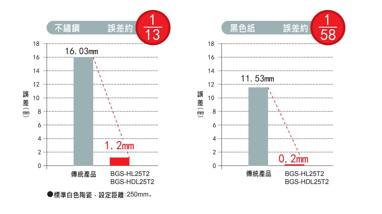 BGS-HL25T2 / BGS-HDL25T2與傳統產品相比較,偵測不同材質工件(不鏽鋼/黑色紙)時設定距離與實際距離之間的誤差。不鏽鋼時誤差約是傳統產品的1/13,黑紙時約1/58。