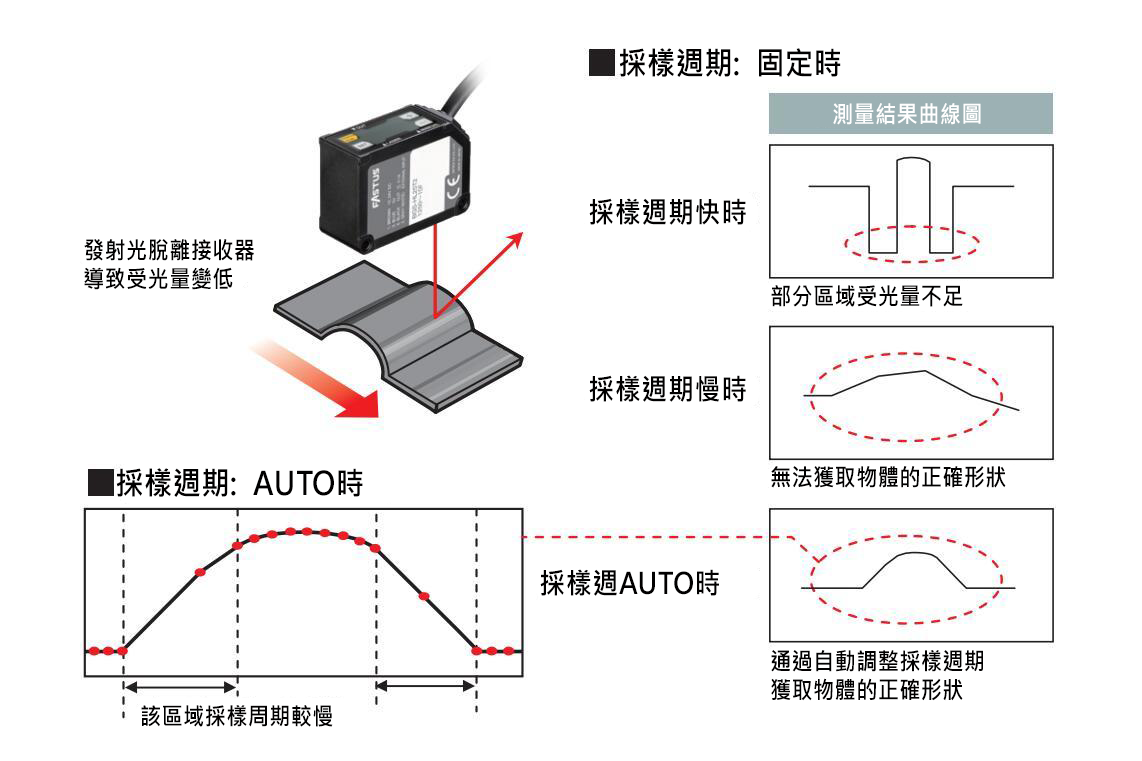 BGS-HL/BGS-HDL搭載【採樣週期:AUTO】功能,即時自動調整目前的採樣週期。就算物體傾斜導致反射光量不足的情況也可進行穩定檢測。