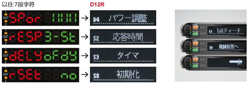 實作了傳統7段LED無法顯示的漢字與假名。即使沒有說明書也能輕鬆辨識設定項目,有效縮短設定時間。
