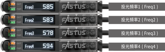 並列設定多台D12R系列產品時,可透過將各擴大機的投光頻率設定為不同數值,有效防止因相互幹擾引發的誤動作。本功能最多可支援4台設備同時使用。