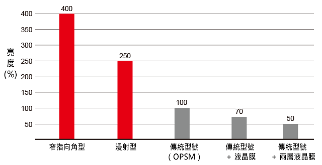 - 亮度提升:窄指向角型亮度 4 倍,漫射型亮度 2.5 倍。