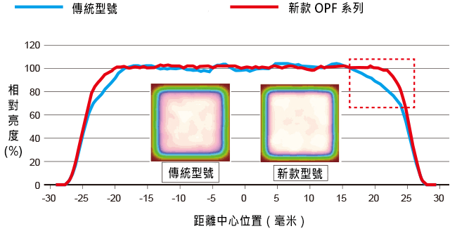 OPF系列照明燈具的擴散板上配備了專有的稜鏡片,可實現與傳統液晶膜相當的窄指向角(半值角±17°)。這種