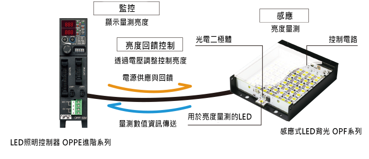 OPF系列燈具採用Optex FA的「FALUX感應」技術。內建光電二極體用於監測亮度,從而回饋長期亮度衰減情況,使燈具能夠保持出廠預設亮度約50,000小時。這有助於降低運作期間的維護成本。 OPF系列燈具
