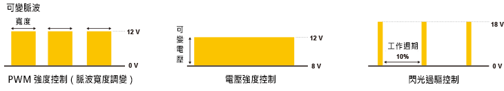 - 多模式控制:提供 PWM、電壓控制與頻閃過驅動三種光強度模式。