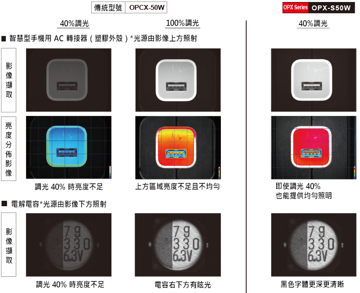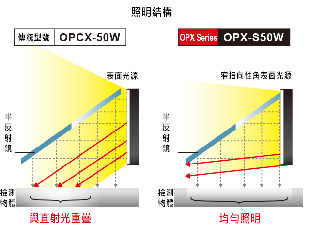 而OPX系列產品採用窄光束角光源,有效抑制光線擴散,實現高度定向照明。即使在近距離照明,也能獲得高度均勻的照明效果。