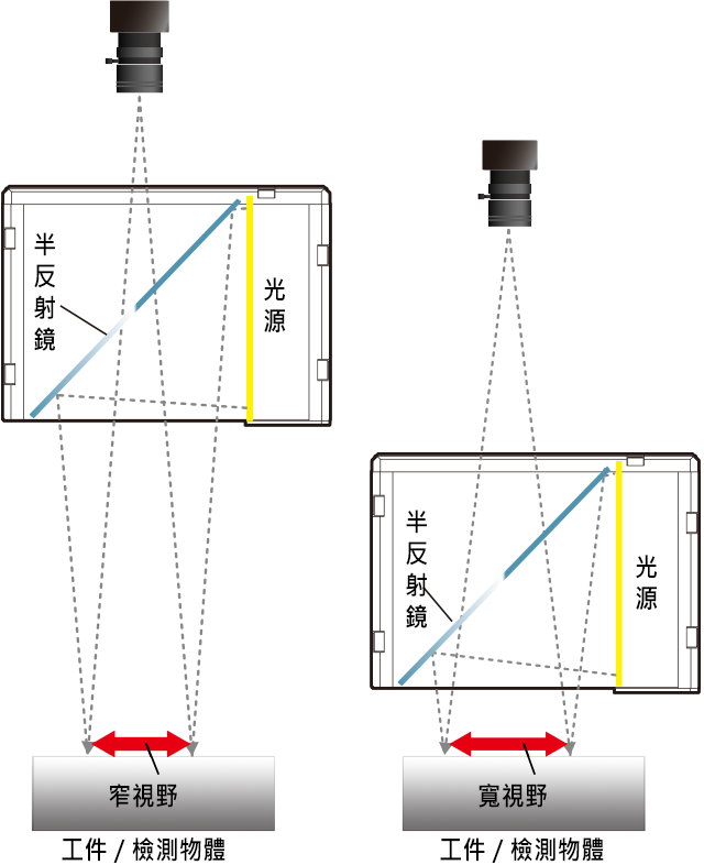 同軸照明是一種漫射光源,光線從多個方向照射到物體上,因此難以辨識細微刮痕和表面粗糙度的細微差異。此外,在近距離照明時,光源的直射光與半鏡的反射光重疊,導致偵測表面無法均勻照明。