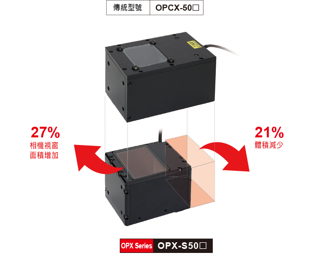 採用SMD型LED可實現超薄光源,大幅縮短燈具外殼長度。 OPX系列燈具的體積比傳統型號減少高達21%。這使得即使在空間有限的緊湊型檢測台上也能安裝照明設備。此外,OPX系列燈具三面均設有安裝孔,進一步提升了安裝的彈性。