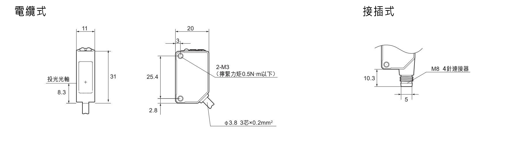 | 連接形式 | 電纜式: 線長2m, ø3.8mm 接插式: M8 4針 | |||||
